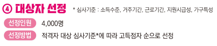 선정인원은 총 4,000명이며 심사기준에 따라 고득점자 순으로 선정되며 선착순 신청이 아니라서 7.17일까지 준비하시면 됩니다.