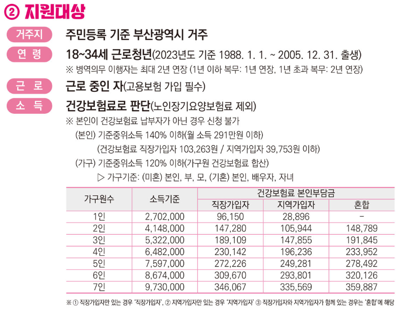 주민등록지 기준으로 부산광역시 거주하고 있는 18~34세 근로청년들이 신청할 수 있으며 병역의무 이행자는 최대 2년연장할 수 있습니다.