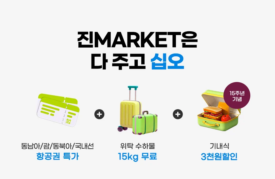 진에어가 연중 최대 특가 행사인 2023년 7월 17일에 오픈한 진마켓(진MARKET) 이벤트를 20일까지 운영합니다.
