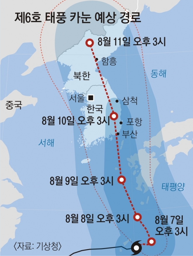 제6호 태풍 카눈 예상 경로는 경남과 전남 사이 남해안으로 상륙하는 것으로 이전보다 서쪽으로 옮겨갔다. 다만 카눈 강풍반경(15㎧ 이상의 바람이 부는 구역)이 300㎞ 이상이어서 전국에 영향을 미칠 것으로 보이는 점은 변함이 없다.