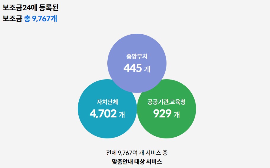 보조금24에 등록된 보조금은 총 9,767개이며 그 중 맞춤안내 대상 서비스를 제공합니다.