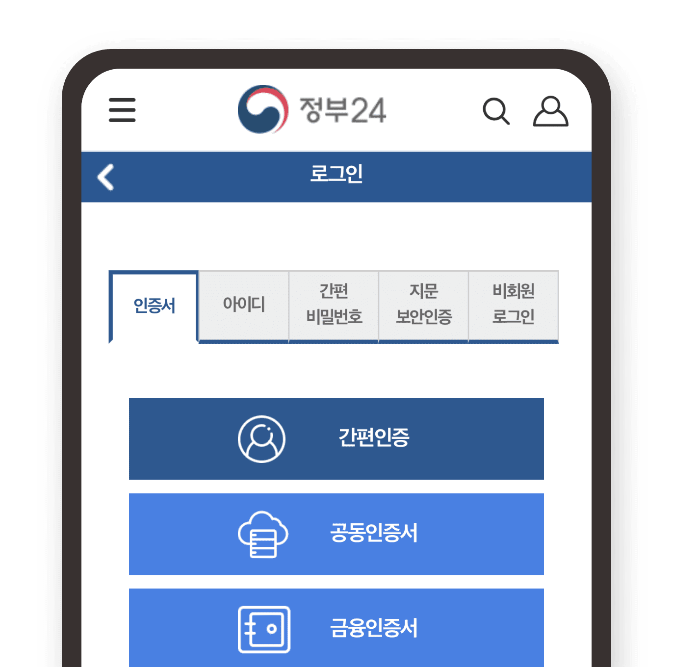 온라인으로 신청하실 경우, 보조금24의 맞춤안내 조회는 정부24 회원 대상 서비스이기 때문에 아직 회원이 아니시라면 회원가입 후 이용가능하며 휴대폰으로 본인 확인하는 간편인증과 인터넷 뱅킹, 증권거래용 인증서로 로그인할 수 있습니다.
