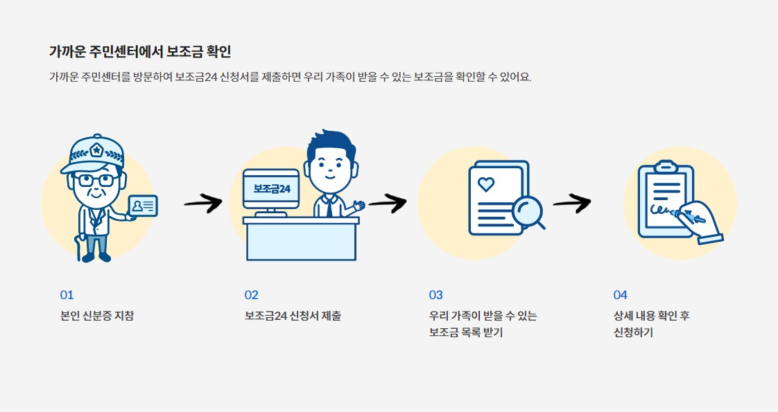 오프라인인 경우, 가까운 읍면동 주민센터를 이용하시면 되는데 먼저 본인 신분증을 지참하여 방문 후에 보조금24 신청서 제출을 하면 담당직원이 바로 받을 수 있는 보조금 조회 또는 신청까지 도와준다고 합니다.